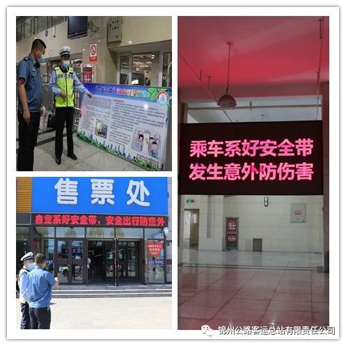 活動期間,凌河交警大隊工作人員利用展板向站內工作人員和旅客宣傳交通安全知識,詳細講解“一盔一帶”的重要性?瓦\站也積極利用站內LED大屏幕宣傳有關安全內容,提醒廣大旅客要全面提高安全意識和防范意識,確保出行安全。與此同時檢查組對出站登記、出站核查、出站班車旅客佩戴安全帶情況進行了抽查。